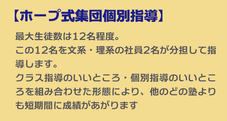 多人数一斉指導では必ず理解不足が生じます。1:1〜1:3の個別指導では1人ひとりにあわせた指導はおこないますが、競争がありません。競争や刺激がない状況では、生徒は自発的に学習に取り組むことはできません。そのため、1人ひとりに合わせた指導と競争・刺激を残した指導を実現するために、【ホープ式集団個別指導】を開発しました。