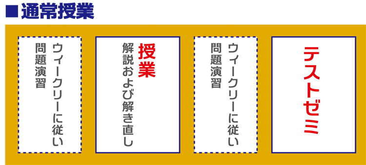 授業中に問題が解けてもテストで解けるとは限りません。テストには授業中の問題演習にはない要素(問題を解く時間、見直し、緊張感など)がたくさんあります。私たちの指導の成果とは、授業中に「わかった」と声をきくことではなく、「テストで点数がとれる」状態にすることです。定期テスト2週間前の日曜日や月曜日を使い、万全な状態にしていきます。